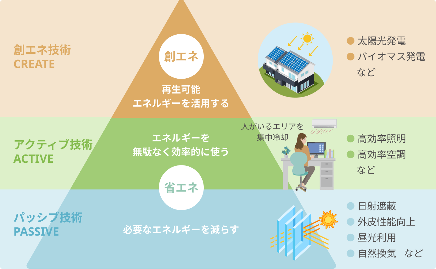 ①パッシブ技術によってエネルギーの需要を減らし、